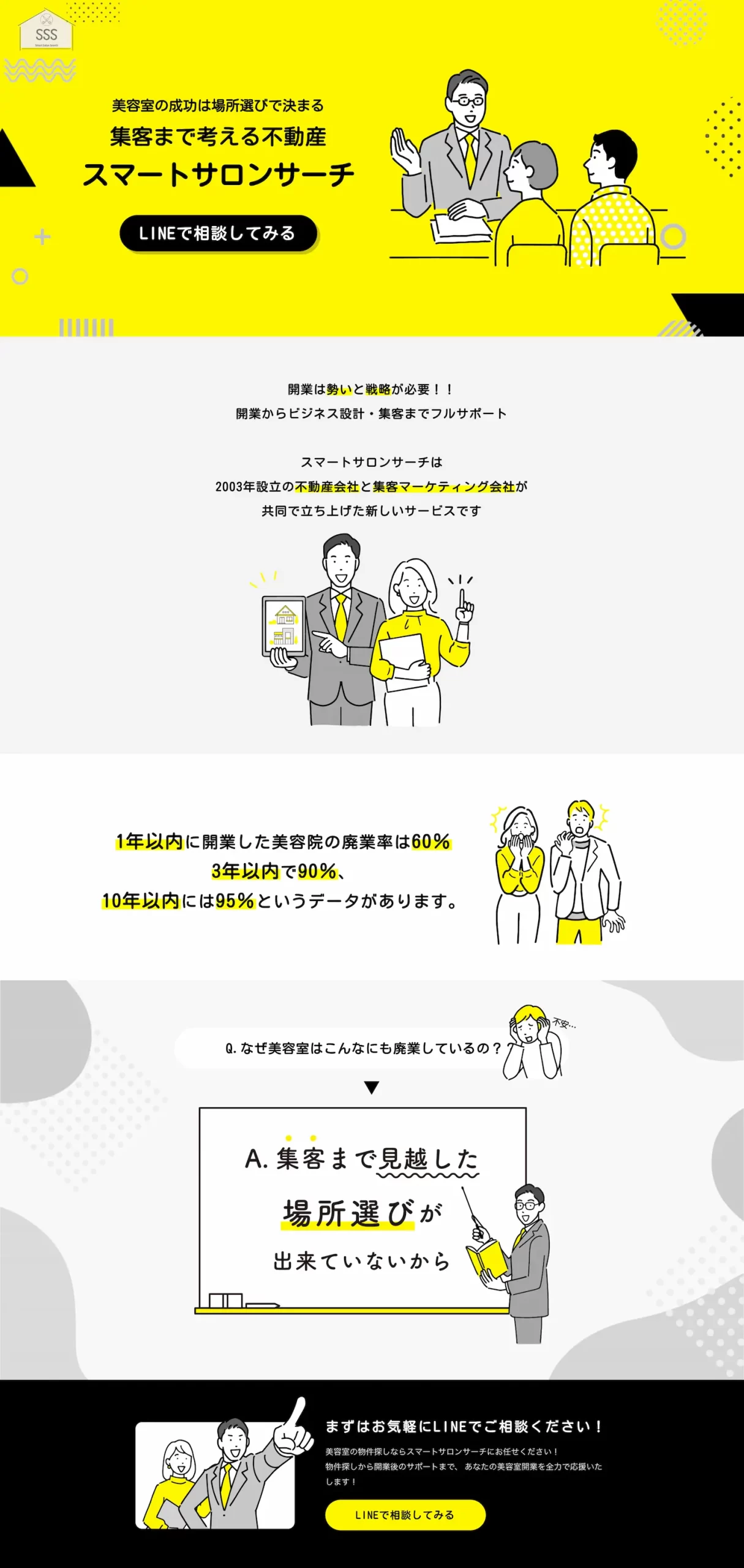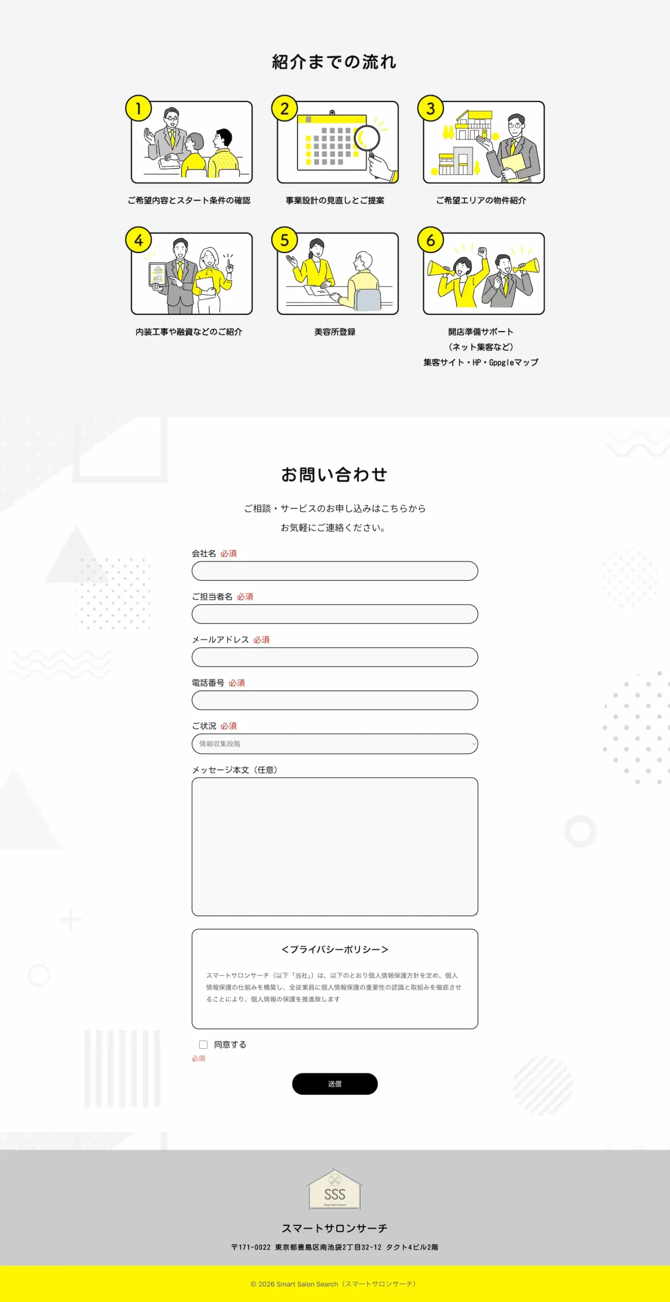 独立を目指す美容師向けに物件探しをサポートするサービスの認知拡大・問い合わせ獲得を目的としたLP制作。